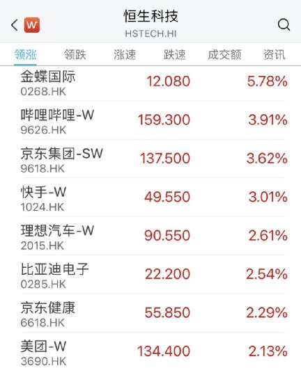 港股低开高走,恒生科技指数涨超1%,恒指涨0.59%,京东、快手、美团、理想汽车等涨超2%。
