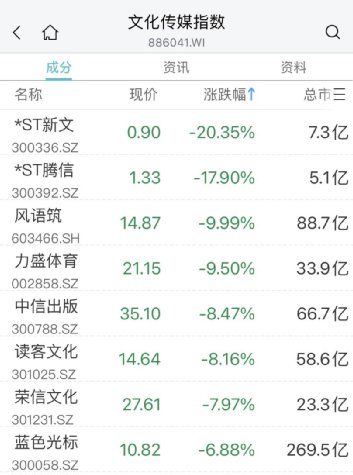 文化传媒板块下挫,*ST新文20CM跌停,*ST腾信跌超17%、风语筑跌停,力盛体育、中信出版、读客文化、荣信文化等跟跌。