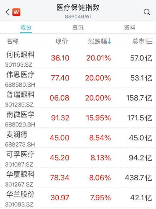 医疗保健板块开盘走强,眼科治疗概念股强势走高,何氏眼科、普瑞眼科、伟思医疗均实现20%涨停,南微医学、华厦眼科、可孚医疗等涨超8%。