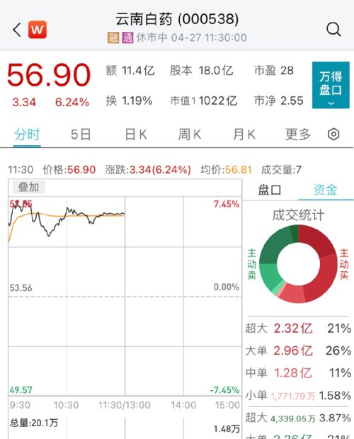 今日中药板块持续拉升,云南白药涨超6%,重回千亿市值,股价创近2个月新高。消息面上,云南白药一季度实现净利润15.18亿元,同比增长66.01%。