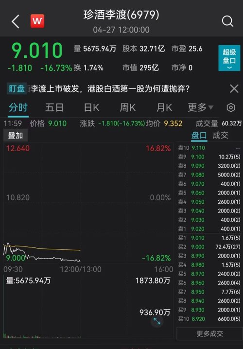 4月27日,“港股白酒第一股”珍酒李渡正式登陆港交所主板,今日开盘直接暴跌16.82%。截至目前,该股报9.06港元,一手浮亏352港元。