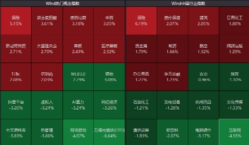 板块方面,保险板块表现强势,医药股全线走强,医药电商、中药、眼科医疗等板块涨幅居前,中字头、大基建表现活跃;另外,网络游戏、AI算力、人工智能等板块跌幅居前。