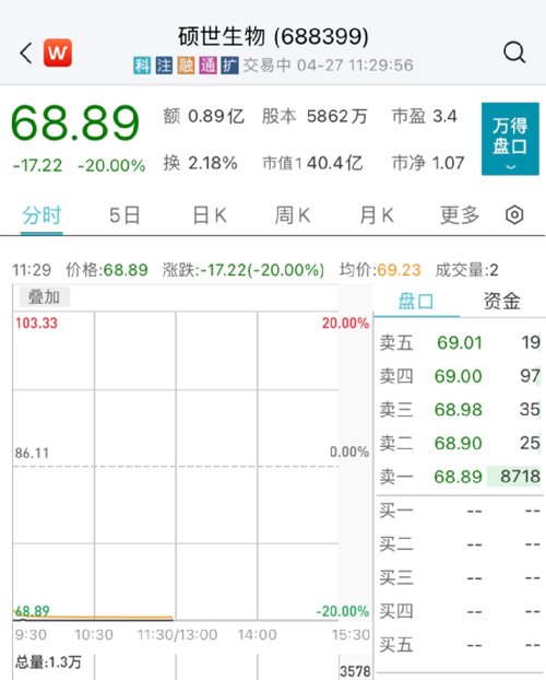 在季报密集披露期,业绩爆雷股开盘大跌。今日开盘,硕世生物直接跌停,报68.89元,总市值40亿元,股价创三年新低。