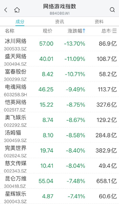 互联网、游戏板块再度下挫。冰川网络、盛天网络、富春股份、恺英网络等大跌超8%。