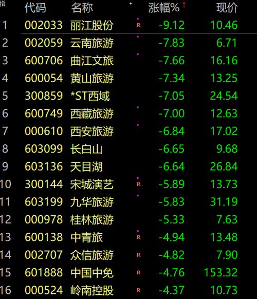 旅游板块集体调整,君亭酒店、丽江股份跌超9%;原因也很简单,旅游板块每年都是在长假前开始炒,过节后就暴跌利好兑现。