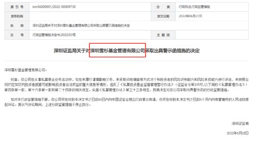 相关公告显示,经查,雪杉基金在从事私募基金业务活动中,存在未履行谨慎勤勉义务、未采取问卷调查等方式对个别投资者的风险识别能力和风险承担能力进行评估、未按照合同约定如实向投资者披露可能影响投资者合法权益的重大信息等情形。依据《私募管理办法》第三十三条规定,决定对其采取出具警示函的行政监管措施。