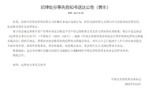 5月4日,中国证券投资基金业协会网站披露了一则纪律处分事先告知书送达公告。经查,深圳雪杉基金管理有限公司(简称“雪杉基金”)涉嫌从事违法违规行为,时任高级管理人员黄某应当对此承担法律责任,协会拟对其作出纪律处分。