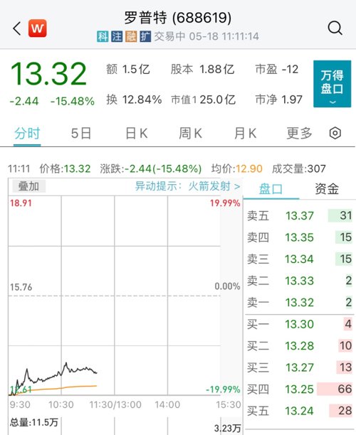 5月17日,罗普特发布公告称,因公司涉嫌信披违法违规被证监会立案调查。受消息影响,今日开盘罗普特直接20CM跌停,随后打开跌停板,截至目前,该股报13.32元,跌超15%,总市值为25亿元。