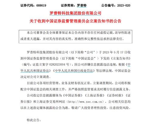 5月17日,罗普特发布公告称,公司收到中国证券监督管理委员会(以下简称“中国证监会”)下发的《立案告知书》(编号:证监立案字0282023004号),因公司涉嫌信息披露违法违规,根据《中华人民共和国证券法》《中华人民共和国行政处罚法》等法律法规,中国证监会决定对公司立案调查。