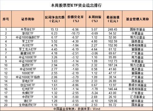 从资金净流出情况来看,本周多只行业主题ETF“失血”较多,并集中在半导体、游戏、军工等领域。