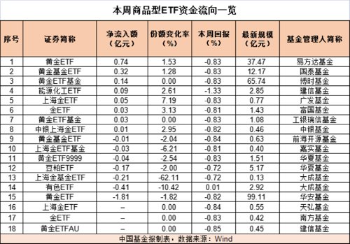 净值表现上,除大成有色ETF本周收获0.01%的正回报外,其余商品型ETF全数下跌,其中建信能源化工ETF本周回报-1.33%,黄金ETF本周平均回报为-0.82%。