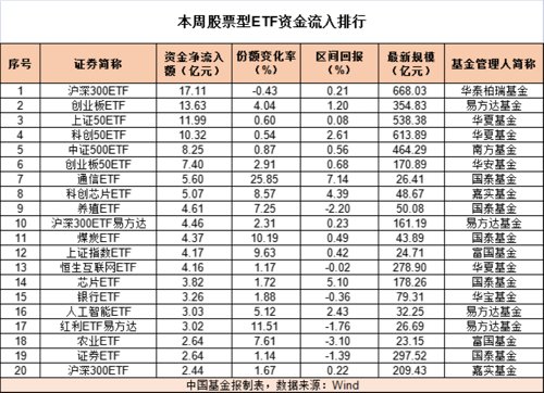 具体来看,华泰柏瑞沪深300ETF、易方达创业板ETF、华夏上证50ETF本周资金净流入额分别为17.11亿元、13.63亿元,11.99亿元,位列前三。同时,华夏科创50ETF本周资金净流入额也超10亿元,该产品近一月来吸金势头迅猛,目前最新份额556.53亿份,产品规模也于本周突破600亿大关,目前达到613.89亿元,成为科创50ETF阵营中的600亿级“基王”。
