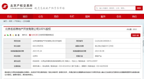 经历数十次挂牌后,5月26日,大悦城控股旗下公司又在北京产权交易所挂牌转让名都地产100%股权,不过转让底价较2019年首次挂牌时的1.32亿元,骤降至6423万元,减少过半。北京产权交易所信息显示,5月26日,大悦城控股旗下公司香港鹏源发展(越秀)有限公司再度转让北京名都房地产开发有限公司100%股权,而转让底价较2019年首次挂牌时的1.32亿元,骤降至6423.096万元,减少过半。