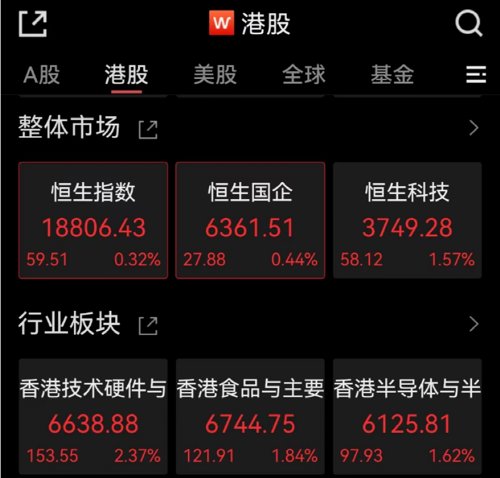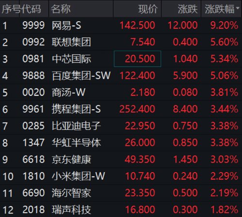 港股市场今日普遍高开:恒指涨0.43%,恒生国企涨0.42%,恒生科技涨1.21%。截至发稿,恒生科技涨幅有所扩大,网易绩后涨幅超9%。
