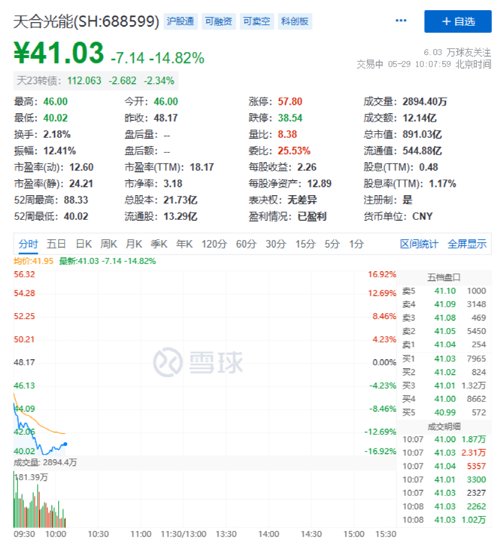 天合光能早盘跳水,盘中大跌近17%,总市值跌下千亿。截至发稿,天合光能跌幅有所收窄,但仍近15%。