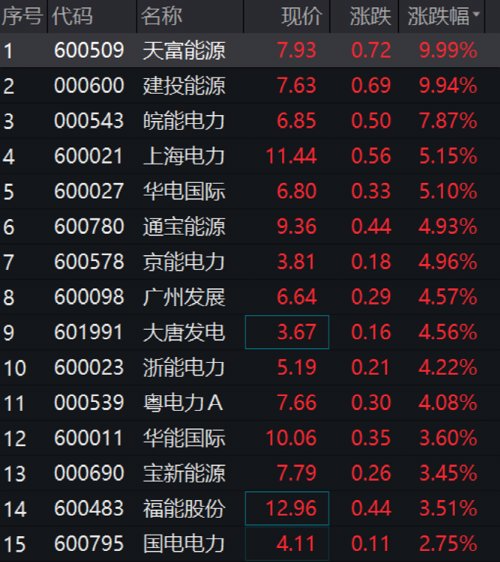 电力板块迅速走强,天富能源、建投能源站上涨停板,皖能电力、上海电力、华电国际等涨超5%。