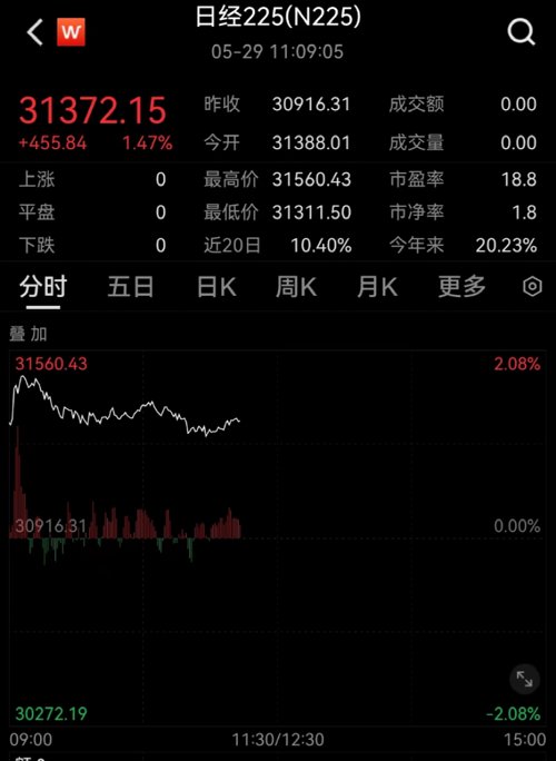 近期日本股市备受市场关注,受美国国债等消息影响,日经225今日开盘一度大涨2%,突破31500大关,创日本泡沫崩溃以来新高。截至发稿,涨幅有所收窄,涨约1.5%。