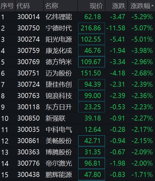 个股方面,宁德时代、亿纬锂能、阳光电源等多只重要权重股跌超5%。