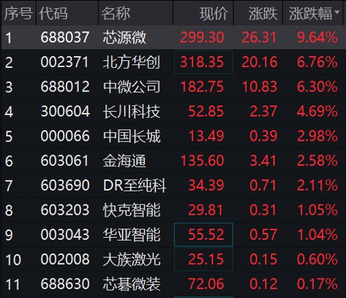上午半导体概念亦有较好表现,北方华创早间短暂触达涨停板,截至发稿涨幅回落至7%左右。芯源微大涨10%,中微公司章超6%。