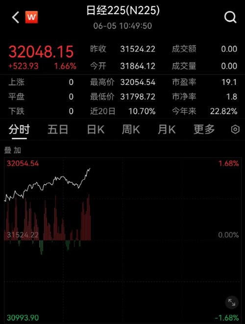 外盘方面,近期连续走高的日经225指数,上午涨幅扩大至1.66%,自1990年以来首次突破32000点,再创市场纪录。