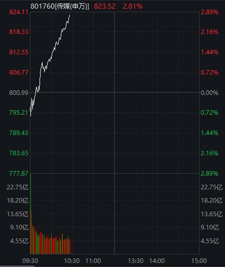 上午表现较好的板块仍是传媒行业,在申万一级指数中冲在最前,板块整体涨近3%。截止发稿前,已经冲高回落,涨幅在1%上下。