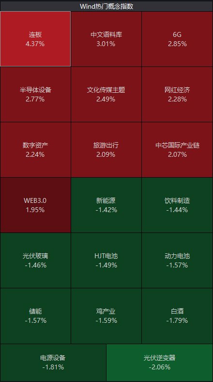 盘面上,上午传媒板块一骑绝尘,中文语料库、网络游戏、网红经济等多个概念板块走高。新能源领跌市场,白酒股表现不佳,舍得酒业封住跌停板。