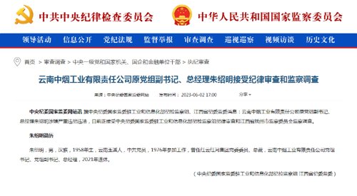 值得注意的是,就在6月2日,中央纪委国家监委网站曾通报,中央纪委国家监委驻工业和信息化部纪检监察组、江西省纪委监委消息:云南中烟工业有限责任公司原党组副书记、总经理朱绍明涉嫌严重违纪违法,目前正接受中央纪委国家监委驻工业和信息化部纪检监察组纪律审查和江西省抚州市监察委员会监察调查。