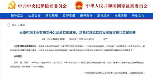 6月6日,中央纪委国家监委网站通报,据中央纪委国家监委驻工业和信息化部纪检监察组、江西省纪委监委消息:云南中烟工业有限责任公司原党组成员、副总经理武怡涉嫌严重违纪违法,目前正接受中央纪委国家监委驻工业和信息化部纪检监察组纪律审查和江西省吉安市监察委员会监察调查。