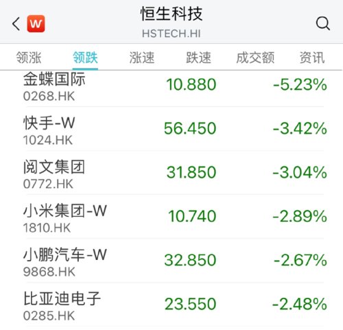 港股方面,三大指数同样下跌,恒生科技指数跌1.5%,快手、小米、小鹏汽车等跌幅居前。