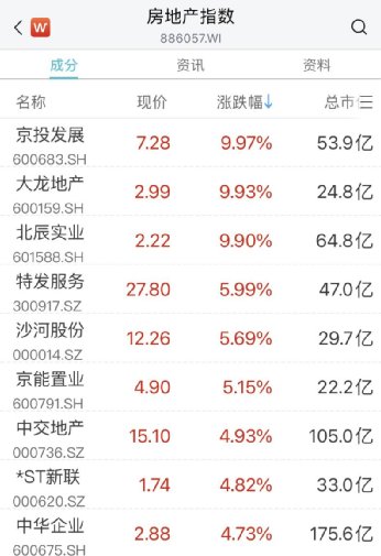 房地产板块异动拉升,京投发展5天4板,大龙地产、北辰实业涨停,特发服务、沙河股份、中交地产等多股涨超5%。