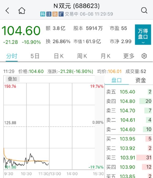 科创板新股双元科技上市首日破发,现跌超16%。科创板新股双元科技上市首日破发,现跌16.9%。该股发行价格125.88元/股,发行市盈率为79.83倍。这也就意味着,中一签赔10000。
