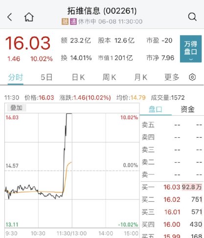 算力方向午前大幅异动,拓维信息深水直拉涨停,封单93万手,当前总市值为201亿元。