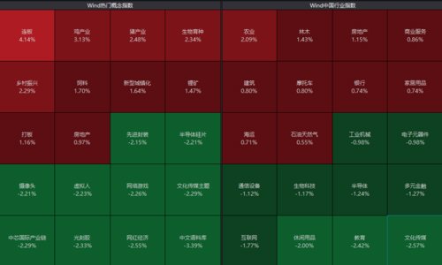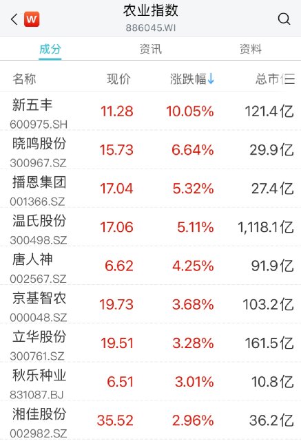 此外,鸡产业、生物育种、饲料等农业股表现活跃。晓鸣股份、温氏股份、唐人神、海大集团等均涨超3%。