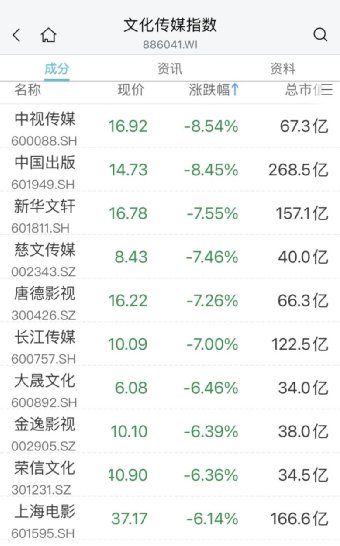 今日下跌方面,AI应用方向跌幅居前,文化传媒、网络游戏、教育、虚拟人等板块走低。浙文影业跌停,中视传媒、中国出版、新华文轩、慈文传媒等均跌超7%。
