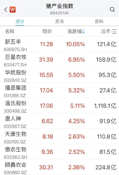 A股养殖板块异动拉升,猪肉股快速走高,新五丰涨停,巨星农牧、温氏股份、华统股份、唐人神等跟涨。