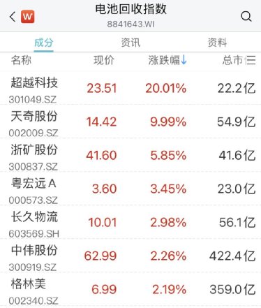 另外,随着碳酸锂价格走高,电池回收概念拉升,超越科技20CM涨停,天奇股份、浙矿股份、格林美等表现活跃。