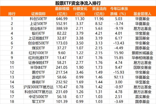 此外,富国上证指数ETF、华安创业板50ETF分别净流入3.19亿元和3.13亿元,易方达沪深300ETF、易方达科创50ETF及嘉实中证500ETF净流入资金均在1亿元以上。