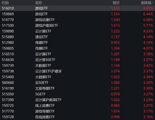 从今日股票ETF二级市场表现来看,游戏、云计算、文化传媒等行业主题ETF涨幅霸屏。