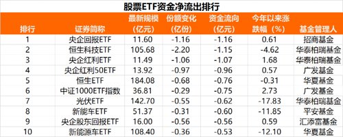 从资金净流出榜单看,3只股票ETF当日资金净流出超过1亿元,其中1只为宽基指数,另外2只为行业主题。而在净流出前5大股票ETF中,央企回报主题占据3席,恒生科技ETF、恒生ETF各占1席位。