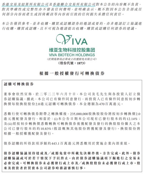 6月11日,维亚生物发布公告表示,拟向弘晖基金及淡马锡等机构发售本金总额为470万港元的可转换债券。债券认购的所得款项净额约443.1百万港元将悉数用于实施企业内部重组。