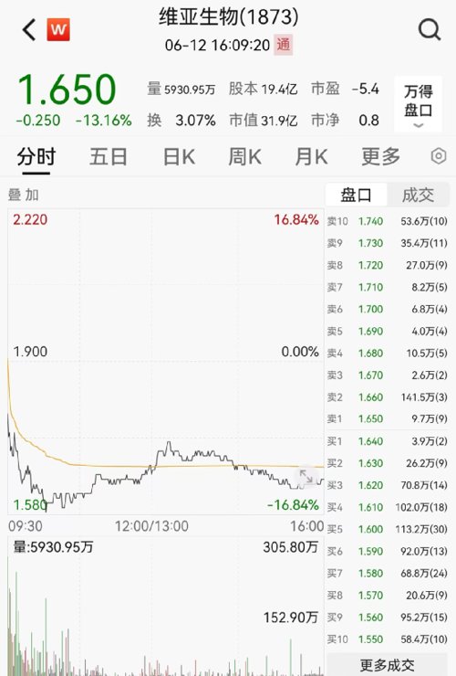 6月12日,领先新药发现技术平台运营商维亚生物股价大跌,最高跌幅达16.84%,全日收于1.65港元,跌13.16%。而公司于11日公告称,向淡马锡、弘晖基金等机构发售470万港元可转债,用于公司内部重组。若悉数行使转股权,淡马锡、弘晖基金将分别持有公司6.91%和3.92%股权。
