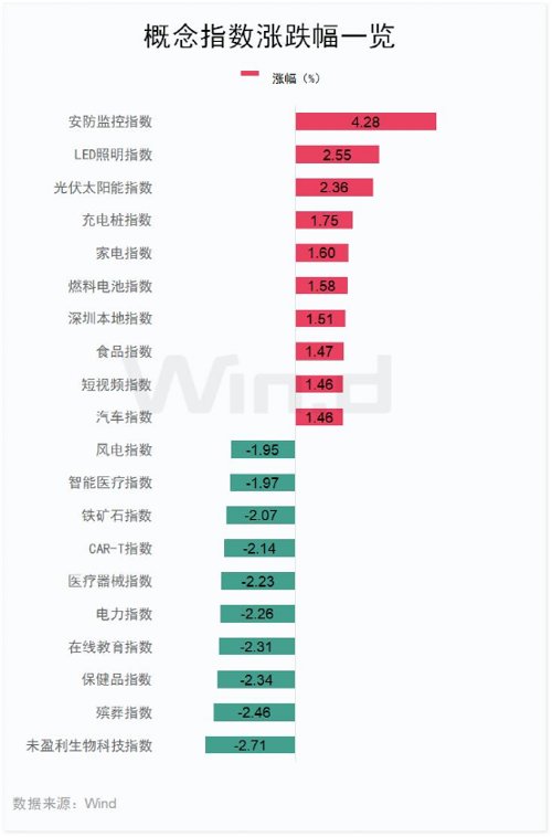 从盘面来看,Wind概念板块涨跌不一,安防监控指数领涨4.28%,LED照明指数涨2.55%,光伏太阳能指数涨2.36%,未盈利生物科技指数跌2.71%,殡葬指数跌2.46%,保健品指数跌2.34%。