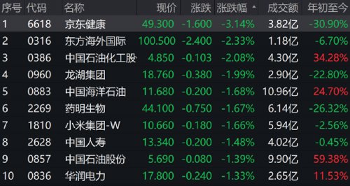 医药、能源股走弱,京东健康跌3.14%,东方海外国际跌2.33%,中国石化跌2.08%,领跌蓝筹。维亚生物跌超13%,联合能源集团跌超8%。科技股涨跌不一,明源云、金山云涨近4%。