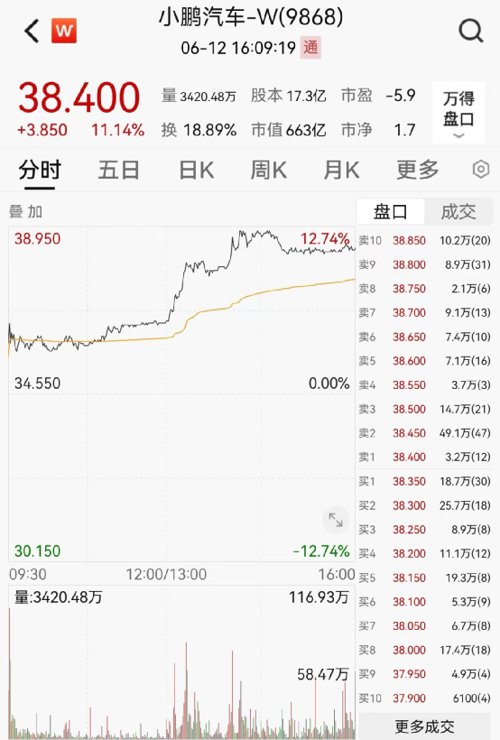 6月12日,新车型小鹏G6预售热卖,令小鹏汽车股价大涨,最高一度涨12.74%,最终收报38.40港元,涨11.14%。
