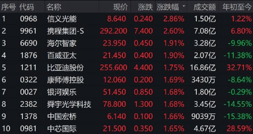据Wind资讯,汽车、大消费领涨,小鹏汽车大涨11.14%,蔚来涨4.73%。信义光能涨2.86%携程集团涨2.60%领涨蓝筹。