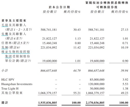 根据公告,若可转换债券附带之转换权悉数行使,维亚生物将按初步转换价每股股份2.0港元,向弘晖基金旗下HLC SPV,淡马锡旗下的Huangshan Investments及True Light H配发及发行2.35亿股换股股份,相当于公司目前已发行股本的约12.14%。初步转换价较公告发布之前交易日6月9日收盘价1.90港元溢价约5.26%。