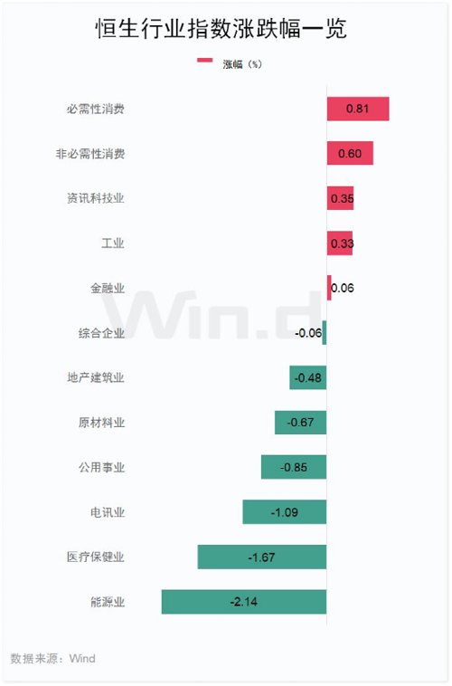 从行业表现看,恒生行业指数日内涨跌不一,必需性消费涨0.81%,非必需性消费涨0.6%,资讯科技业涨0.35%。跌幅方面,能源业跌2.14%,医疗保健业跌1.67%,电讯业跌1.09%。