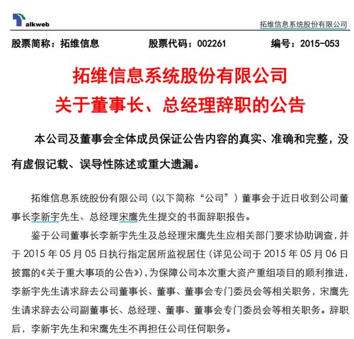 而在2015年6月的时候,拓维信息董事长、总经理都离职了。当时的背景是,董事长李新宇、总经理宋鹰应相关部门要求协助调查,并于 2015 年 05 月 05 日执行指定居所监视居住,为保障公司重大资产重组项目的顺利推进,李新宇请求辞去公司董事长、董事、董事会专门委员会等相关职务,宋鹰请求辞去公司副董事长、总经理、董事、董事会专门委员会等相关职务。辞职后,李新宇先生和宋鹰先生不再担任公司任何职务