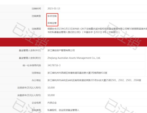 今年1月13日,中基协发布公告,包括澳创资产在内的50家私募机构,因存在异常经营情形,且未能在书面通知发出后的3个月内提交符合规定的专项法律意见书,而被协会注销私募基金管理人登记。注销时,澳创资产有1只备案产品已经清算,并有2只产品未在系统提交清算。