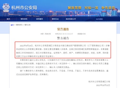 值得注意的是,早在去年4月,杭州市公安局西湖区分局便依法对澳创资产涉嫌非法吸收公众存款案立案侦查;并对孙某涛、白某等五名犯罪嫌疑人采取刑事强制措施;同年10月,主要犯罪嫌疑人孙某涛、白某被移送西湖区检察院审查起诉。